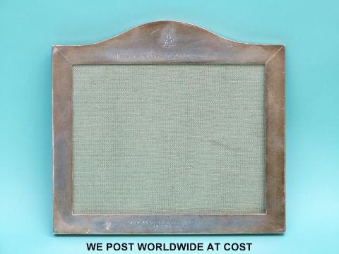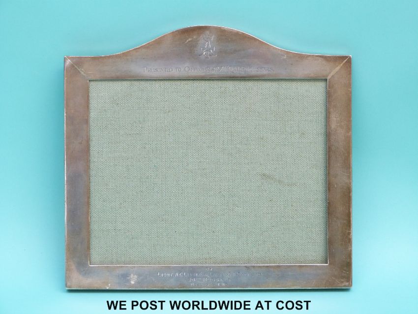 A George V hallmarked silver photograph frame by Goldsmiths & Silversmiths Company, 112 Regent Street, engraved to the front "Presented to Officers 19th (Q.A.O.R) Hussars by Lieut A.C.Little & Lieut G.A.Sanford 20th Hussars, December 1910", width 26.5cm