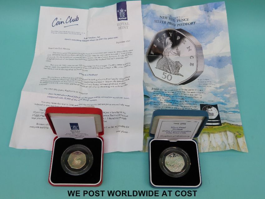 A 1994 silver proof piedfort 50 pence coin together with a 1997 reduced size example, both cased with certificates