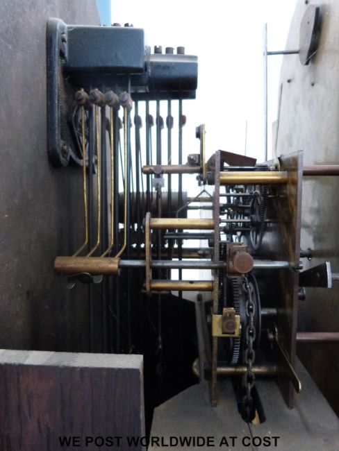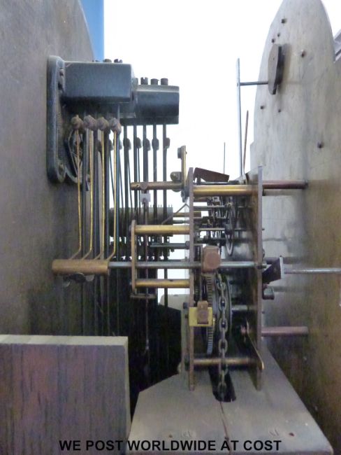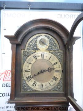 Embee German mid 20thC oak cased longcase clock, the 8 day duration movement with three chime options - Westminster, Whittington and St Michael. The brass Roman dial with silvered chapter ring, dolphin and masked spandrel detail, strike and chime silent facility options. The plain oak case with oval bevelled glass to door and arched hood, 188cm tall
