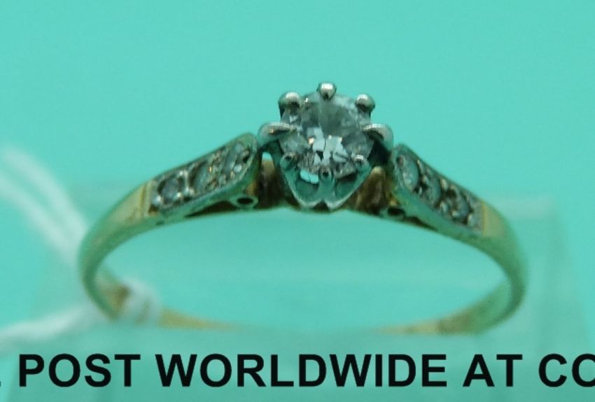 An 18ct gold ring with a central diamond and diamonds to the shoulders (size Q)