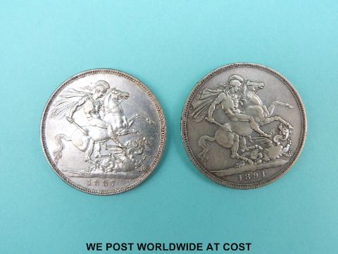 An 1887 Jubilee head Victorian crown together with an 1891 example