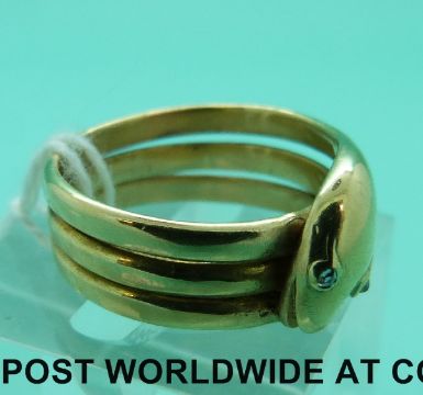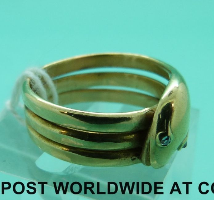 An 18ct gold ring in the form of a snake set with rose cut diamond eyes, London 1893 (8.4g, size M)