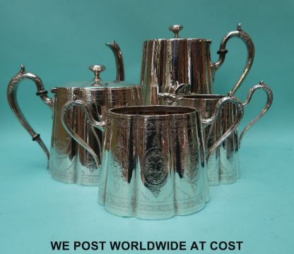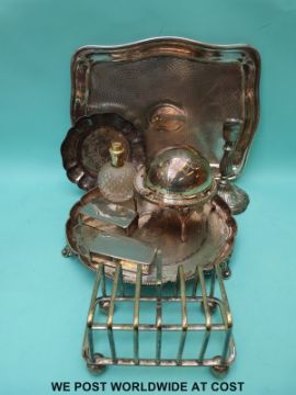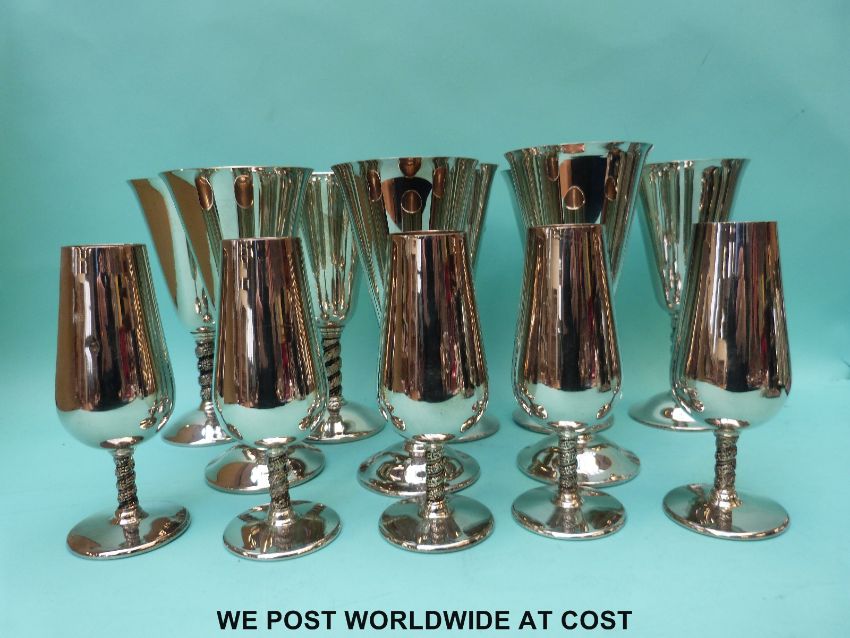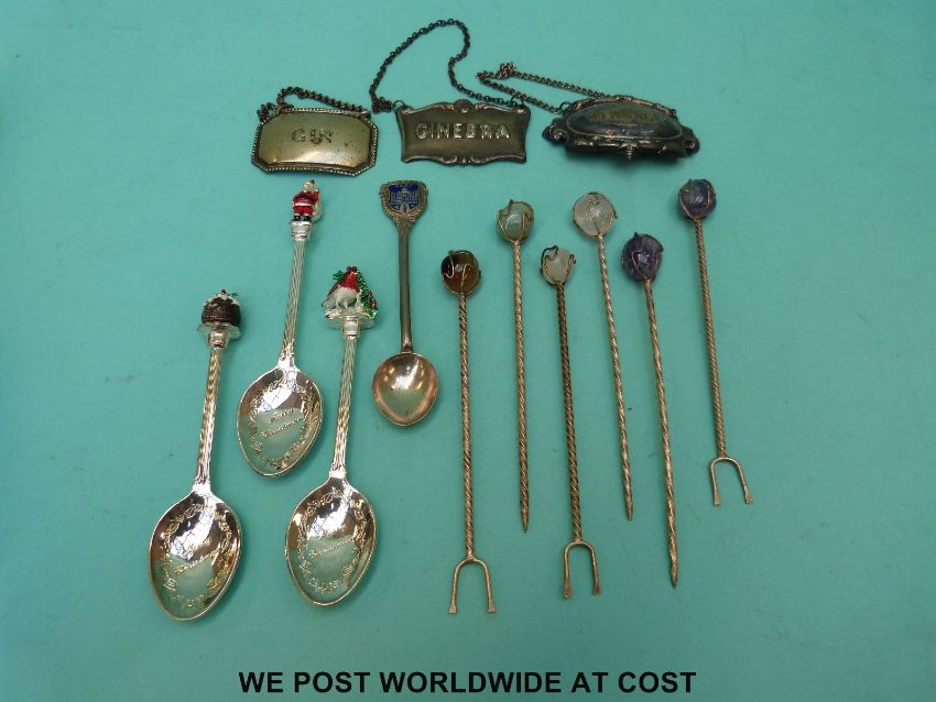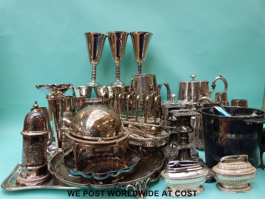 A quantity of plated ware including tea set, trays, goblets, candlesticks, bottle tickets etc.