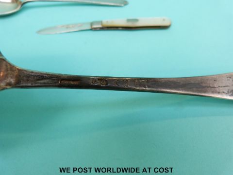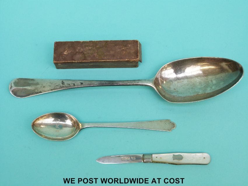 A Georgian bottom hallmarked silver table spoon, marks rubbed but possibly London 1770 maker's mark possibly WS or SW, length 21cm (51g) further hallmarked silver teaspoon (17g) and a hallmarked silver and mother of pearl folding fruit knife