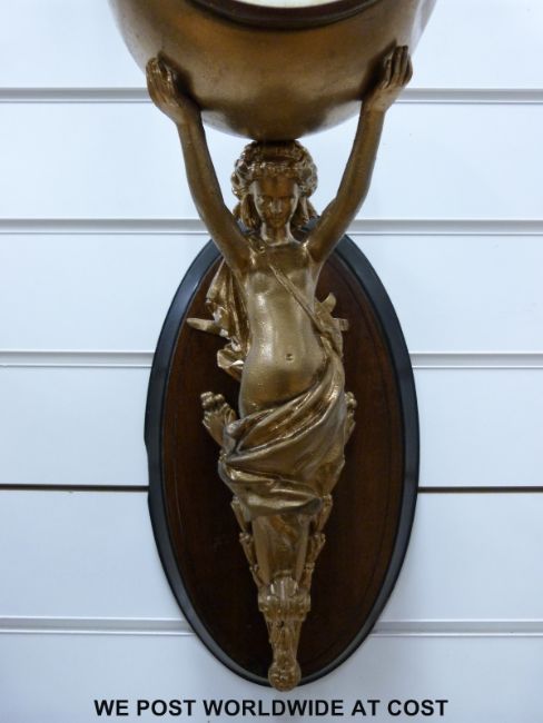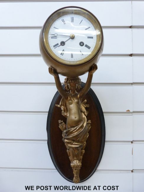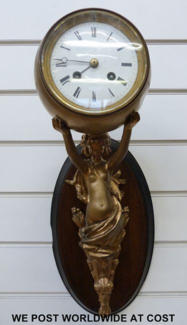 A 19thC wall sconce ball clock, supported by classical female spelter figure, the Japy Freres movement in orb case with enamel dial, Roman numerals with Breguet style hands, striking on a bell