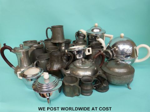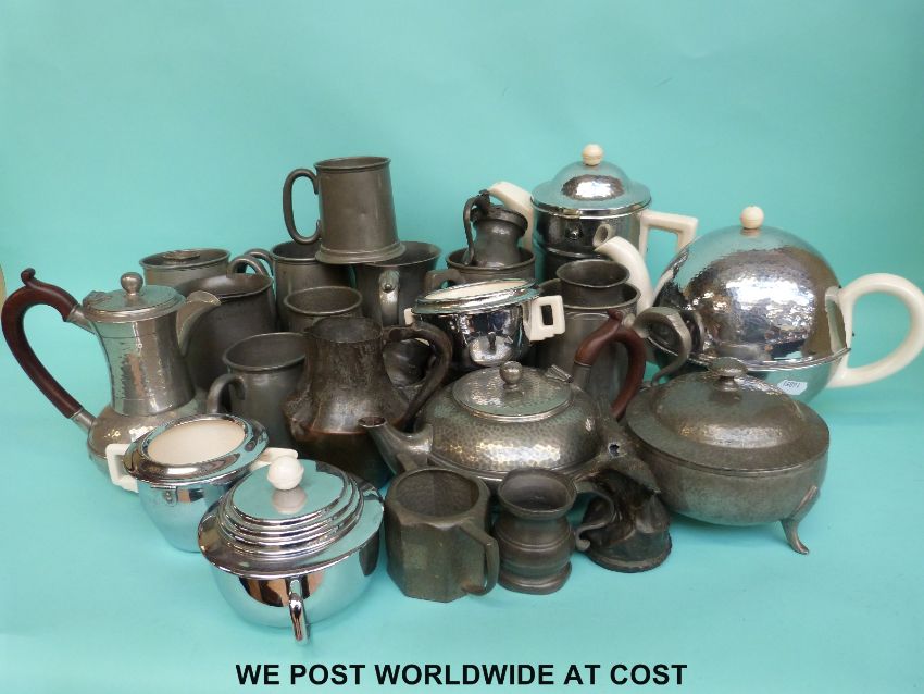 A quantity of pewter including hammered Arts & Crafts items, retro Heatmaster tea set etc,