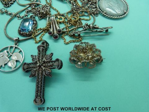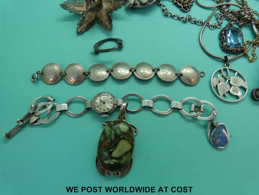 A hallmarked silver bangle with engraved chased decoration, a pewter bangle, a silver brooch set with abalone, two filigree brooches in the form of a flowers, agate set pendant, filigree cross pendant, white metal brooches, silver Aldo watch, silver ingot, silver pendant set with an opal etc