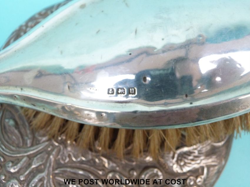 A hallmarked silver backed mirror, silver brush, Exeter spoon, Eastern white metal dish etc
