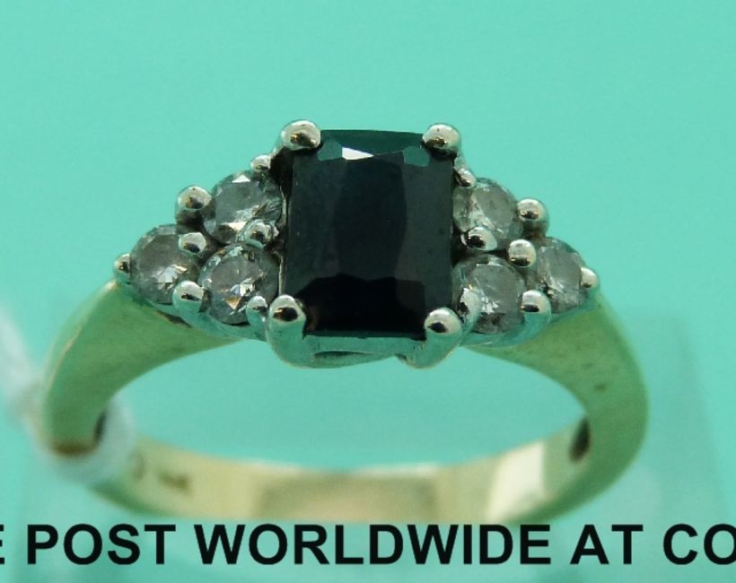 A 14ct gold ring set with an emerald cut sapphire with three diamonds to each shoulder (size N)