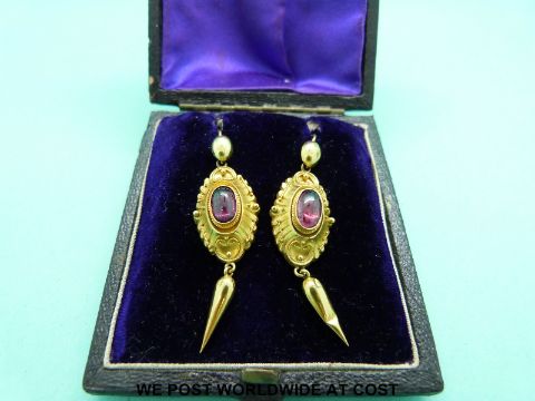 A pair of Victorian yellow metal earrings set with garnet cabochons
