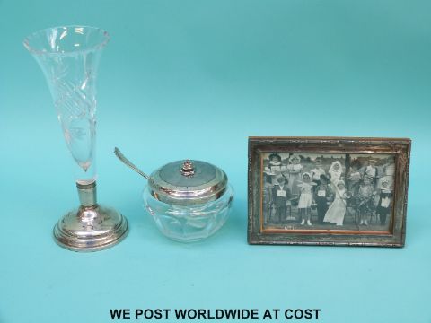 A Georg Jensen silver mounted glass sucrier, spoon, hallmarked silver mounted glass vase and a hallmarked silver photograph frame, height 14.5cm