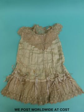A late Victorian silk satin and lace girl's dress with satin tassels and finely made lace to the collar, buttoned at the back
