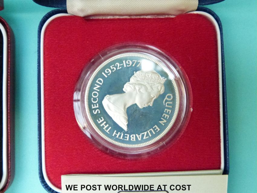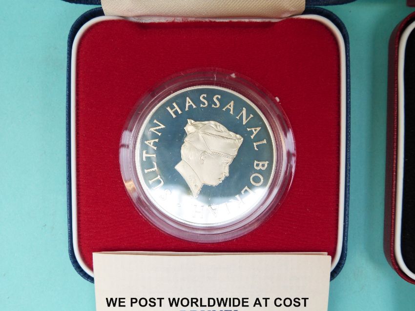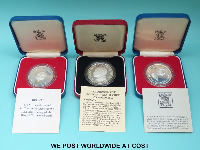 Three cased silver crown sized coins comprising Botswana, Silver Jubilee Falklands 50p crown and Brunei $10 with certificates