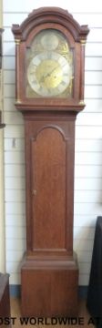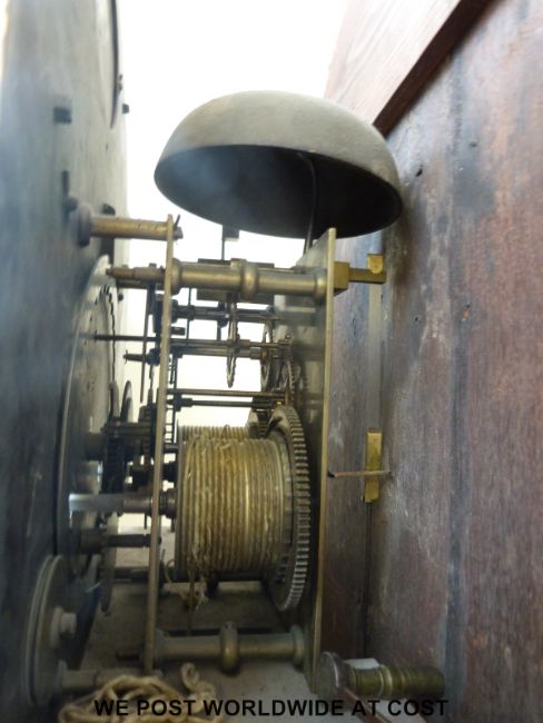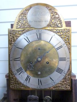 Ian Yardley, Bishop Stortford early 19thC oak case long case clock, the 8 day movement striking the hours on a bell. The arched brass dial with floral and foliate spandrel detail, silvered Roman chapter ring and Arabic minutes, date aperture and secondary seconds. The oak case with arch topped door, the hood with turned columns and gilt capitals, 217cm tall