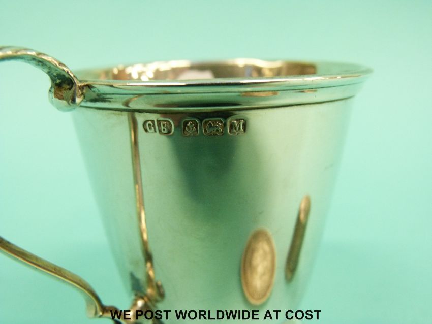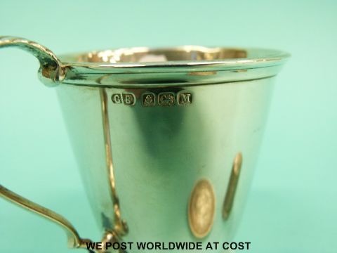 An Edward VIII hallmarked silver christening cup, height 7cm, hallmarked silver 1931 swimming medallion and a hallmarked silver thimble (65g)