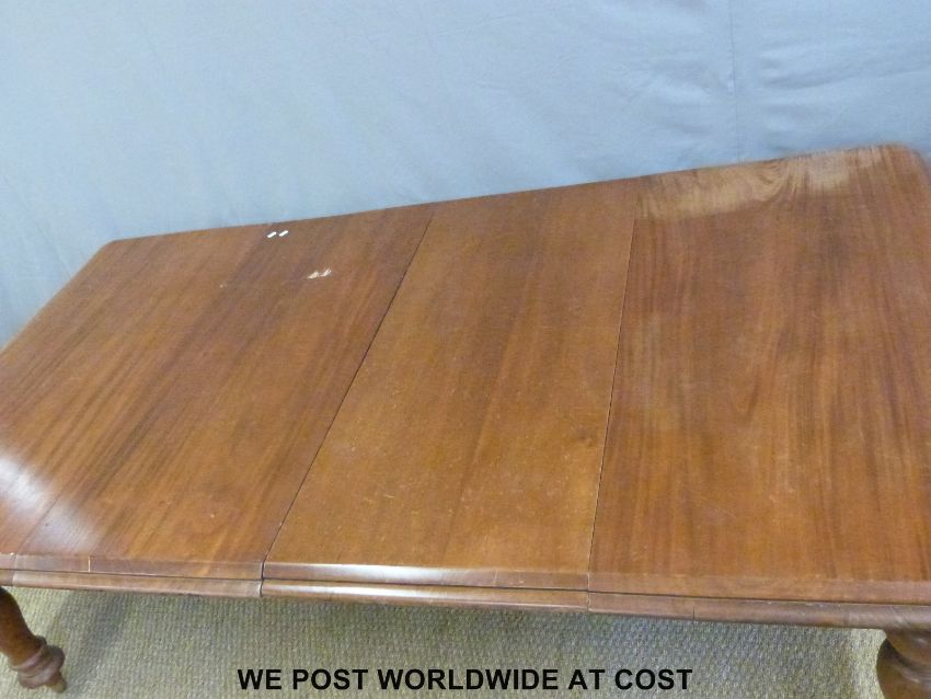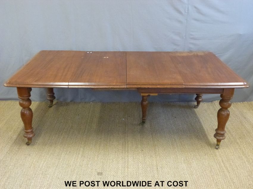 A 19thC mahogany extending dining table and two leaves, raised on five turned legs with brass castors (W124 x min L123, max L227, H74cm)