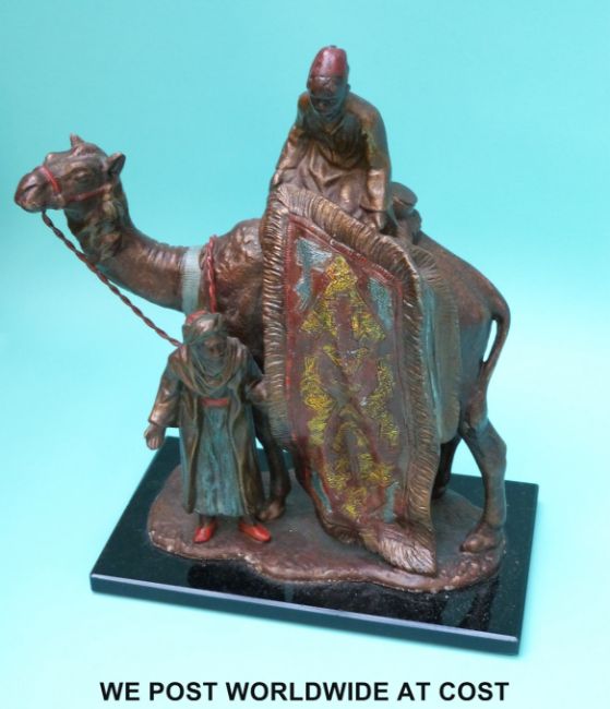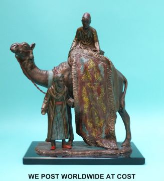 In the style of Carl Kauba (1865-1922) cold painted table lighter in the form of two carpet sellers and a camel on black polished base.