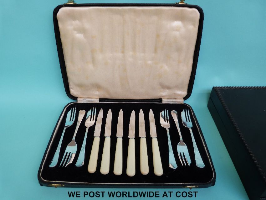 A quantity of silver plated items including cased cutlery sets, gilt edge dressing table set, tankards, Ensign Ful-Vue camera etc