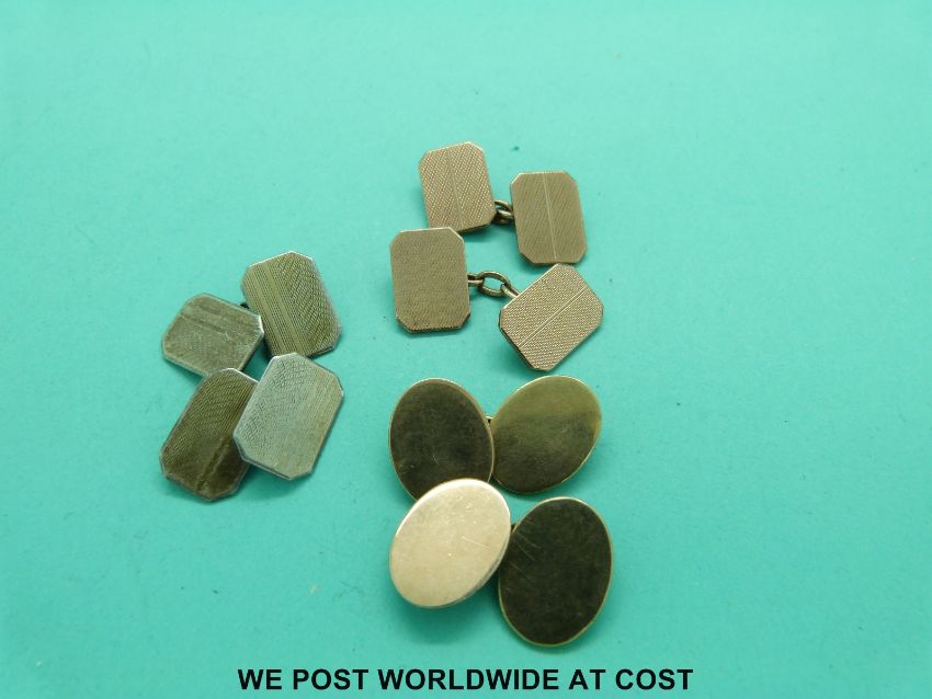 A pair of 9ct gold cufflinks with engine turned decoration, another plain 9ct pair (16.9g) together with a further hallmarked silver pair