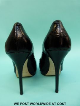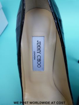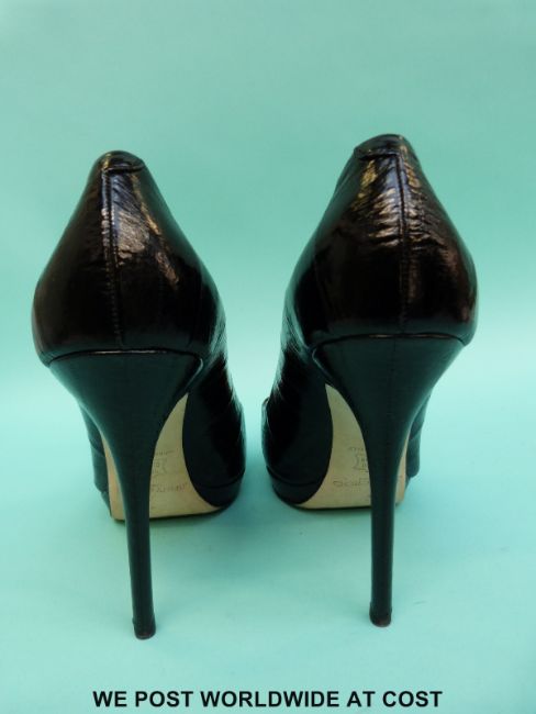 A pair of Jimmy Choo black leather stiletto court shoes, size 39, with original box, cloth bag, purchase receipt and shop bag.
