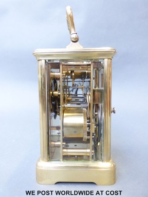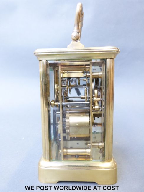 A 20th century brass carriage clock, the keywind movement striking on a gong, the white enamelled dial with Roman numerals, 14cm tall