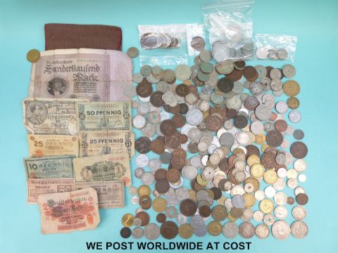 An amateur collection of overseas coinage, 19th century onwards, includes East India Company etc. some silver content together with a few German bank notes