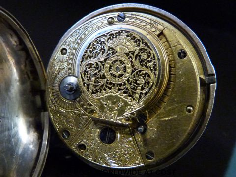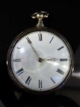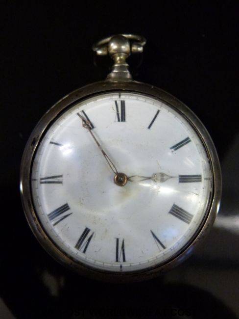 Georgian hallmarked silver pair cased pocket watch with farmer's glass, gold skeleton hands, black Roman numerals, white enamel face, engraved fusee movement, verge escapement and masked and pierced balance cock, London, 1805, case diameter 55mm.