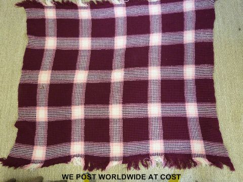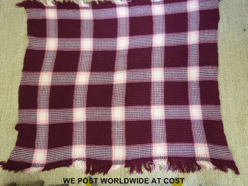 A woven Welsh blanket finished in pink red and white, approximate size 187 x 155cm