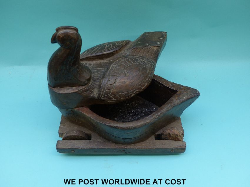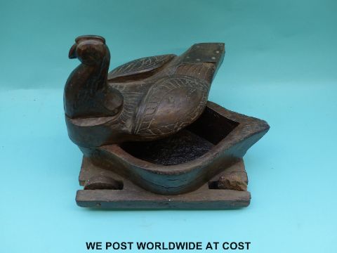 A Scandinavian/Norwegian treen hen pot on wheels, length 28cm