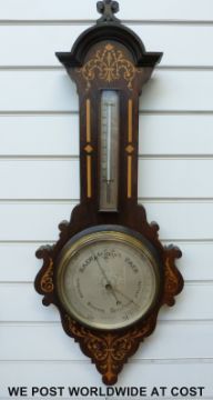 A 19thC holosteric wall barometer in rosewood case with Sorrento style inlaid decoration, the silvered dial with chased central detail, and black arrow hands