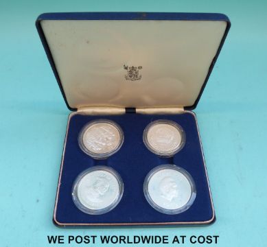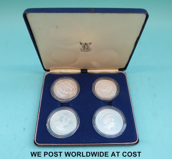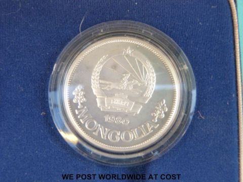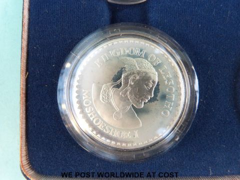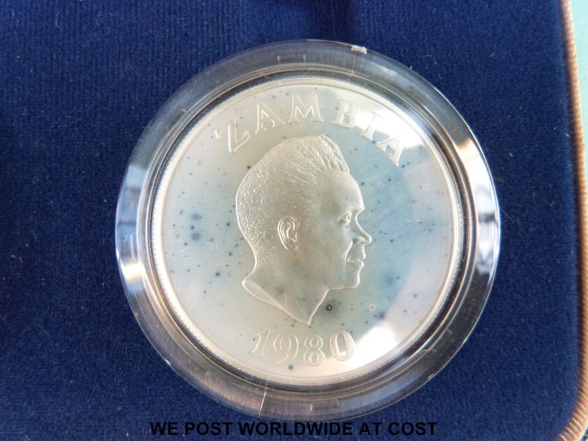 Four 'crown sized' Royal Mint coins in case, Ethiopia, Mongolia, Maloti and Zambia 1979-1980