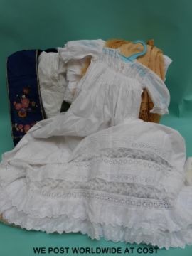 A quantity of items to include ladies gloves, silk handkerchief, christening gown, ladies bag etc