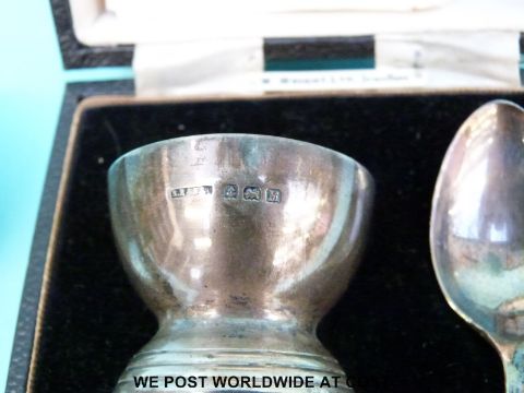 A cased hallmarked silver christening set comprising egg cup, spoon and napkin ring, four further hallmarked silver napkin rings and spoons (202g) together with a plated four person egg cruet, white metal salt marked 830 etc