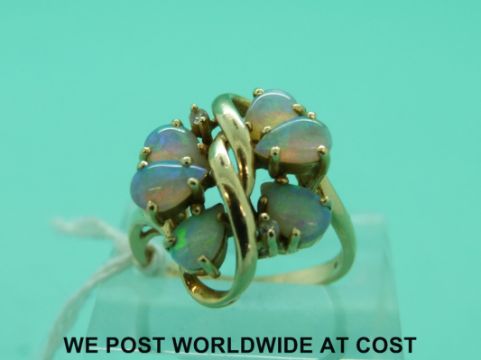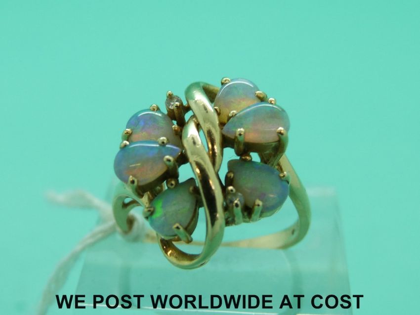 A 14ct gold ring set with six opals and two diamonds (size K)