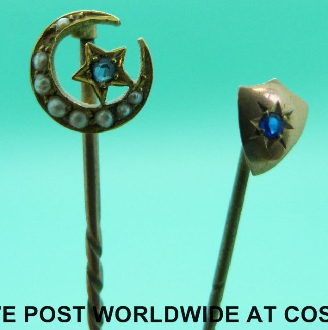 A Victorian stick pin marked 18ct gold set with seed pearls and a sapphire in the form of a crescent and star and a yellow metal stick pin set with a blue stone in a shield shaped setting
