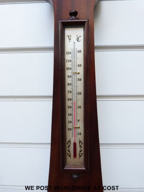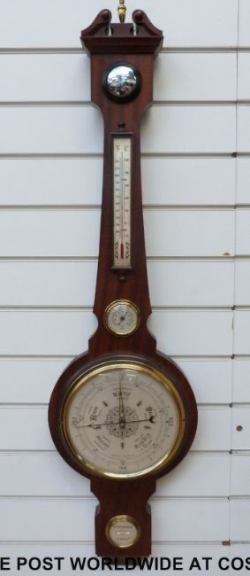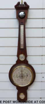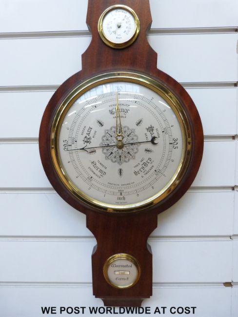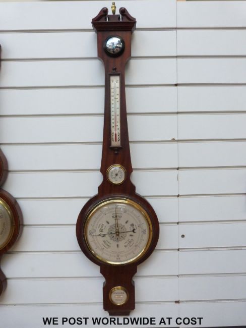 A West German four dialled wall barometer in a Georgian style mahogany case, with swan neck style pediment top, ivory coloured dial with English, German and French prediction names