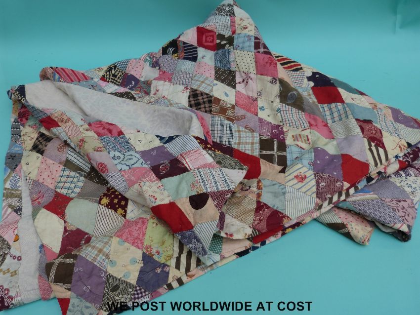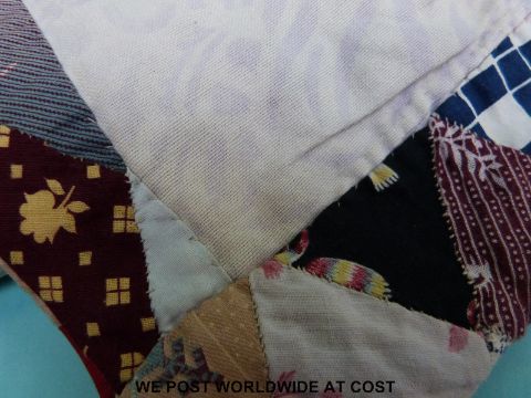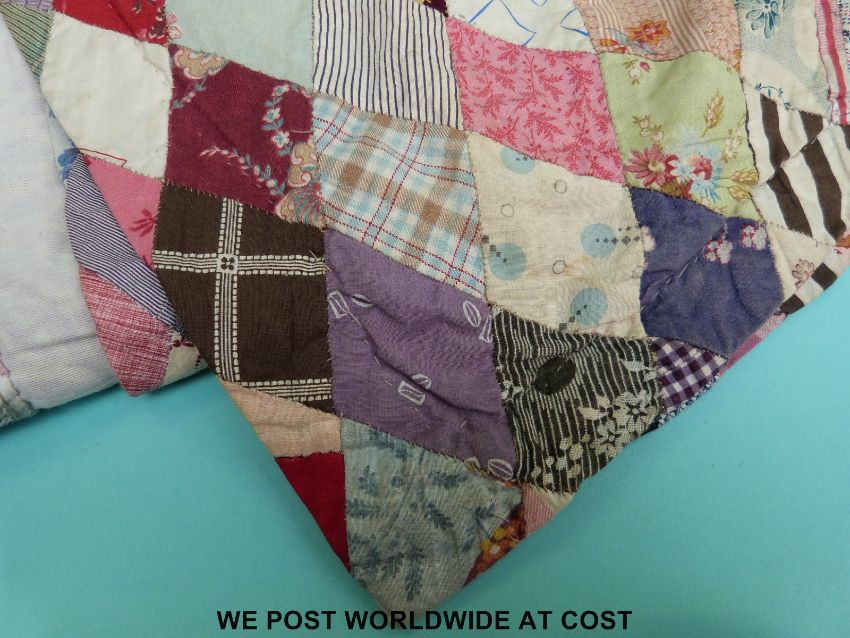 A patchwork quilt with floral and stitch work decoration to the reverse, made up of diamond shaped pieces, size 227 x 191cm