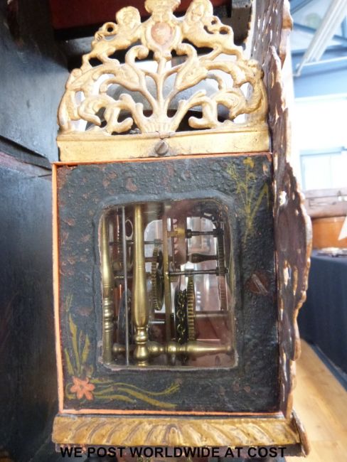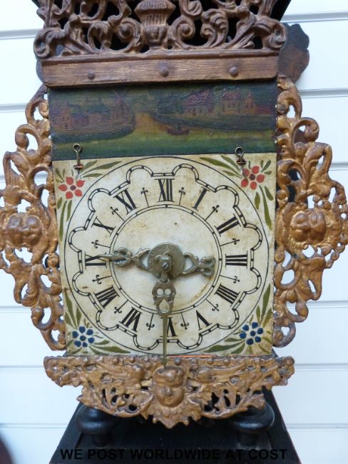 A mid 18th century 30 hour Dutch Friesland Stoelklok of traditional form, the painted Roman dial decorated with floral corners, houses, windmill and boat above, pierced and marked framework, painted case and shelf, the movement with verge escapement striking on a bell, with alarm facility, approximately 76cm tall