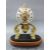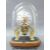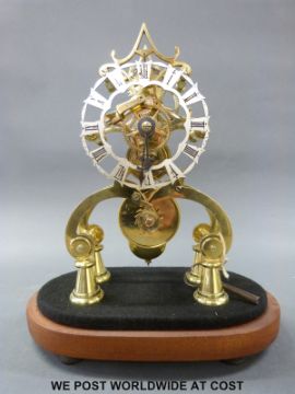 A late 19th century brass skeleton clock with unnamed single fusee movement, under oval glass dome and raised on a wooden plinth, the contrasting white metal chapter ring with Roman numerals and embellished spear shaped blued steel hands