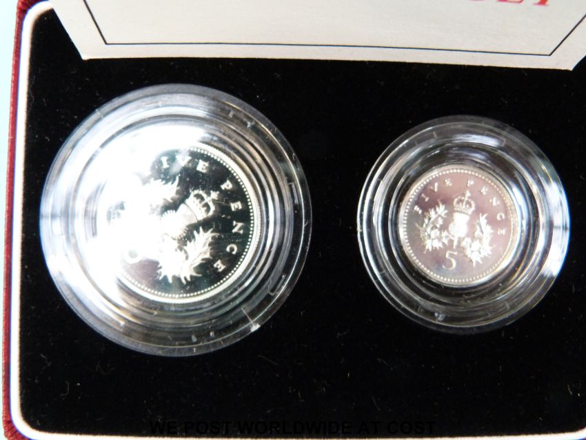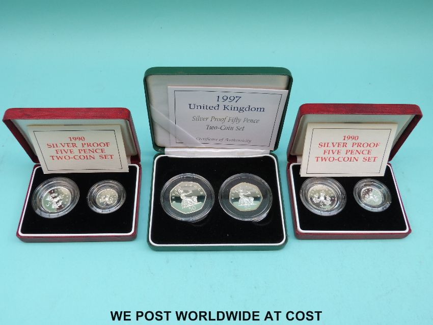 A 1997 UK cased silver proof fifty pence two coin set, together with two cased 1990 five pence two coin sets, all with certificates