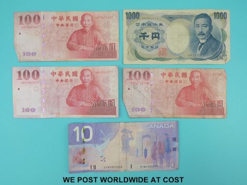 A small collection of overseas bank notes etc. to include Japan 100 Yen Nippon Ginko banknote, three Taiwan 100 Yuan examples etc.
