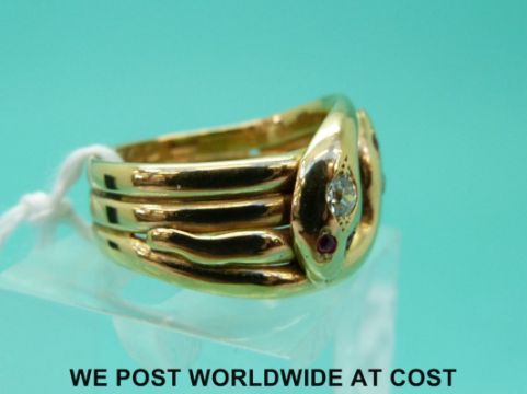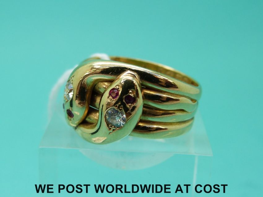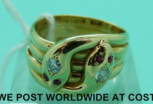 A Victorian 18ct gold ring in the form of two snakes entwined set with diamonds and rubies with Chester 1900 hallmark (size R)