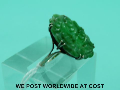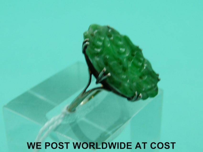 A white metal ring set with carved jadeite (size I)