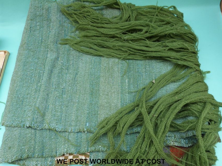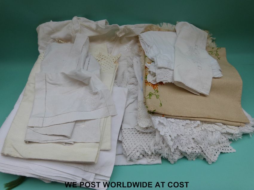 A box containing sheets, table linen, lace etc. to include a hand woven and dyed length of material, oriental style tea cosy, a box containing a set of lace table settings and table cloth etc.