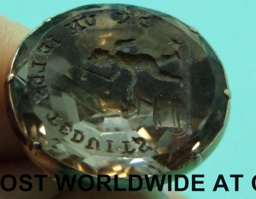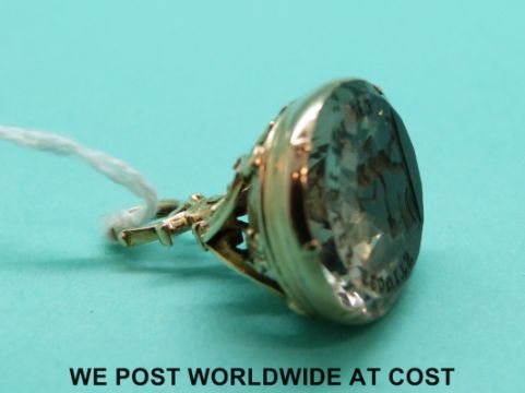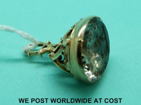 A 19thC gold intaglio fob with Latin inscription and a winged figure with a heart over a cauldron