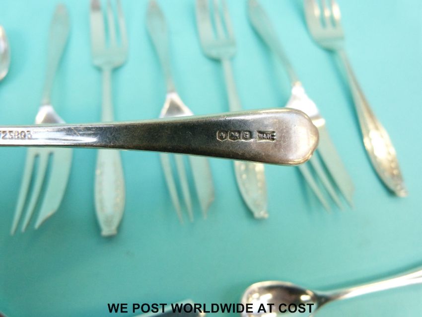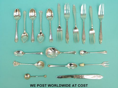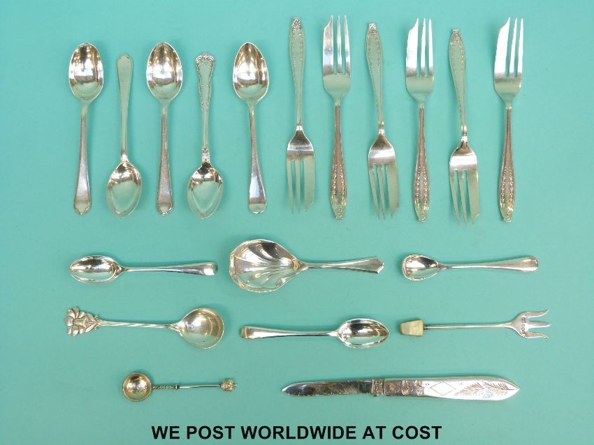 A quantity of hallmarked silver cutlery to include a set of six cake forks, Victorian hallmarked six penny coin spoon etc., (210g) together with three plated spoons and a folding knife