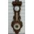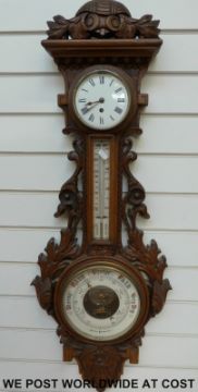 A circa 1900 ornately carved oak aneroid barometer/clock compendium, the enamelled dials having numerals and weather predictions illuminated in red, the clock dial with Roman numerals and spade hands