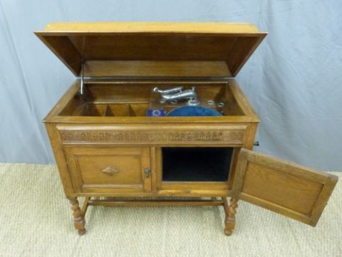 A floor standing gramophone mounted on four twist legs, with internal horn and storage space for records. The horn arm marked 'Gilbert, Sheffield' together with a boxed Gilbert tone reflector and four boxes of 78 r.p.m records