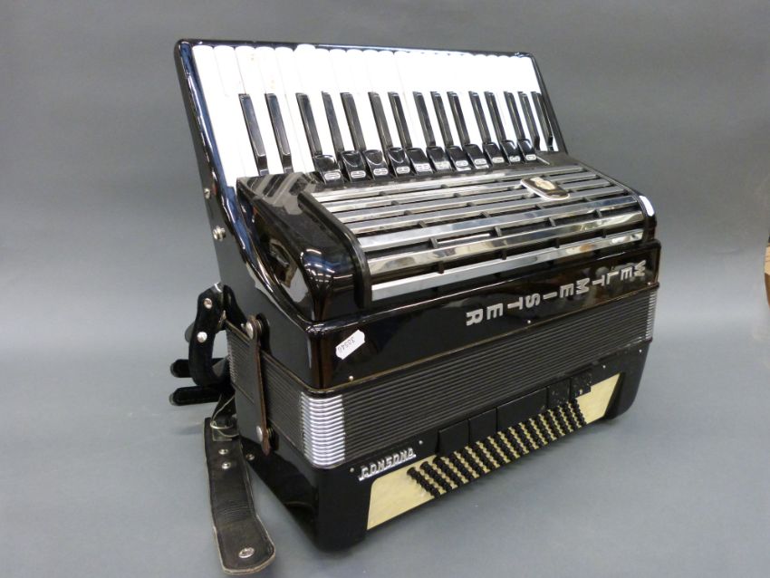 Weltmeister 'Consona' 96 bass piano accordion with eleven treble couplers and five bass couplers, in black gloss finish, with hard carry case