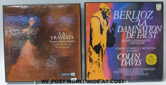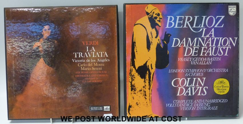 A collection of 27x Opera Box Sets. Most boxes also include LPs of alternative recordings of the same opera. Composers include: Puccini; Rossini; Wagner; Bizet; Berlioz; Mozart; and Verdi etc. Examples are: Angel Series SAN 131-2, SAN 184-6, SAN 252-4, SAN 314-5; Decca SET 343, SET 561; Columbia 33CX 1483;HMV ASD 2776, ASD 2977. The condition of the vinyl, boxes and inserts appears to excellent.